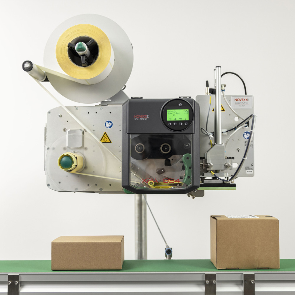 Applies label to moving and stationary products